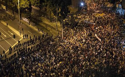 | Protestos em frente ao Maracanã, durante o jogo. |